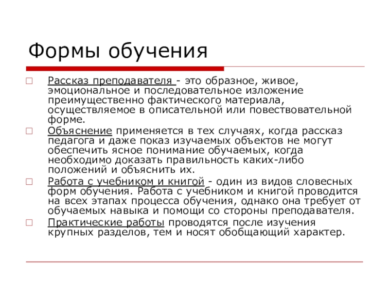 Рассказ преподавателя - это образное, живое, эмоциональное и последовательное изложение преимущественно фактического материала, осуществляемое в описательной или повествовательной форме.