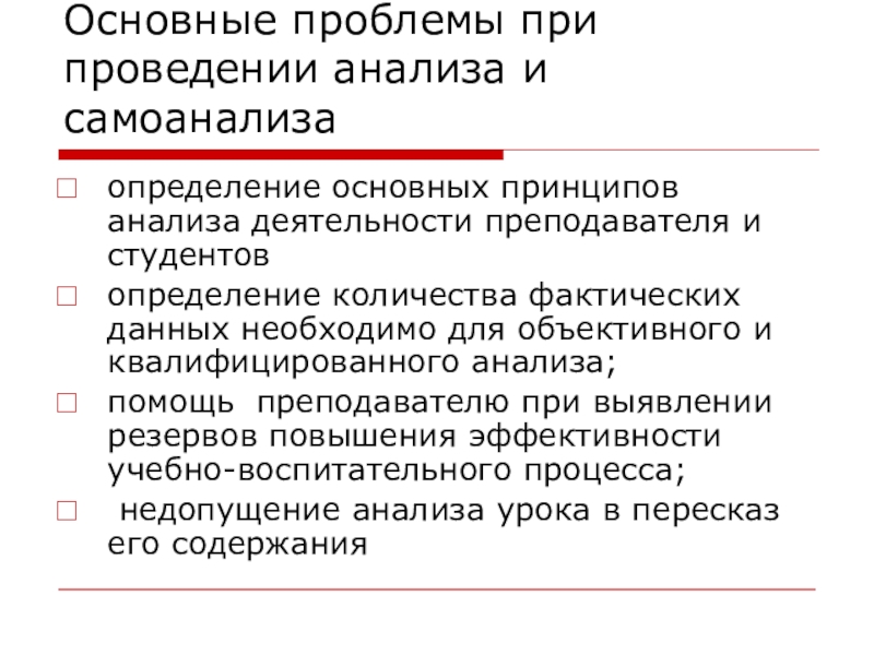 Слайд 12Основные проблемы при проведении анализа и самоанализа