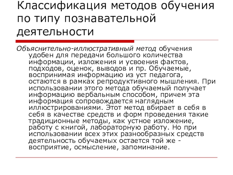 передачи большого количества информации, изложения и усвоения фактов, подходов, оценок, выводов и пр. Обучаемые, воспринимая информацию из уст педагога, остаются в рамках репродуктивного мышления. При использовании этого метода обучаемый получает информацию вербальным способом, причем эта информация сопровождается наглядным иллюстрированиями. Этот метод вбирает в себя в себя в качестве средств и форм проведения такие традиционные методы, как устное изложение, работу с книгой, лабораторную работу. Но при использовании всех этих разнообразных средств деятельность обучаемых остается той же - восприятие, осмысление, запоминание.