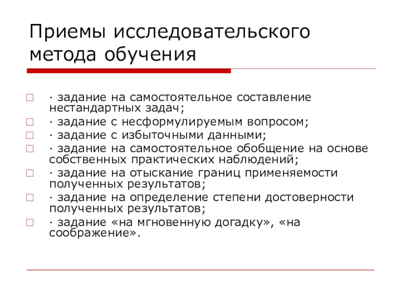 дело самих обучаемых: формулировка проблемы, поиска способа решения проблемы и ее непосредственное решение. Инициатива, самостоятельность, творческий поиск проявляется в исследовательской деятельности наиболее полно. Формы заданий при исследовательском методе могут быть различны. Это могут быть задания, поддающиеся быстрому решению в аудитории и дома, задания, требующие целого урока, домашнее задание на определенный, но ограниченный срок.