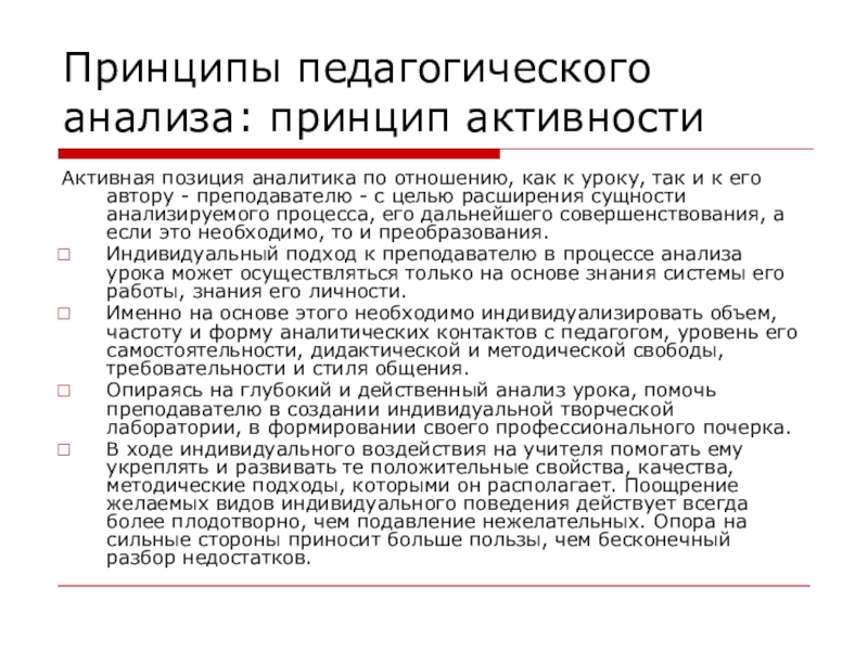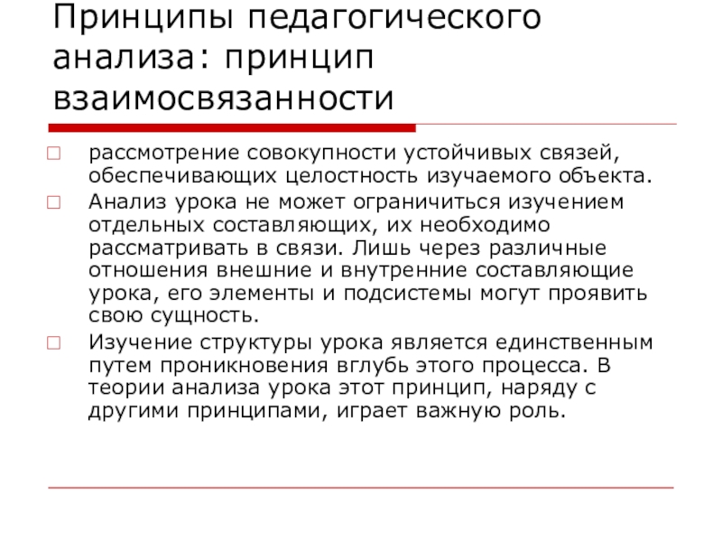 Этот принцип требует от учителя не анализа урока вообще, а конкретного анализа его составляющих, их взаимодействия.