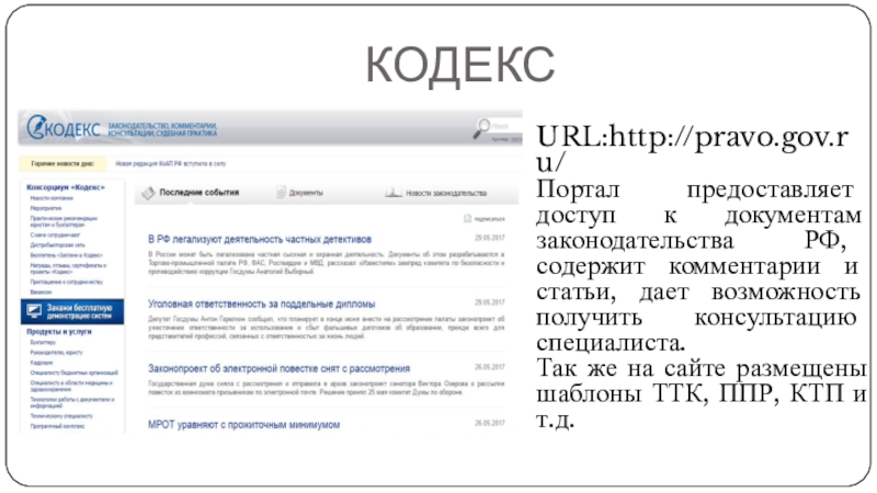 Информационно-правовой портал содержит кодексы, постановления правительства, нормативно-правовые акты.