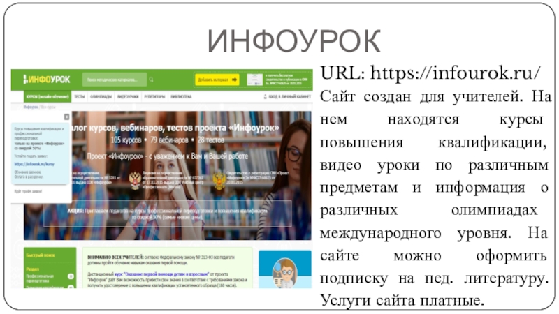 видео уроки по различным предметам и информация о различных олимпиадах международного уровня. На сайте можно оформить подписку на пед. литературу. Услуги сайта платные.