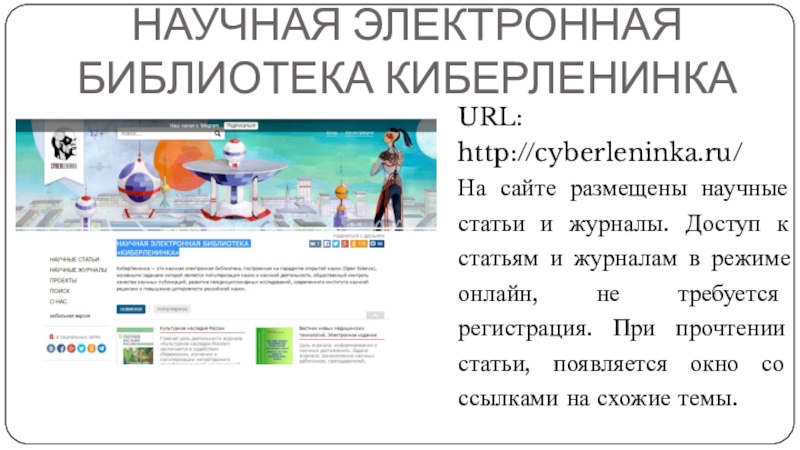 Слайд 15НАУЧНАЯ ЭЛЕКТРОННАЯ БИБЛИОТЕКА КИБЕРЛЕНИНКА
