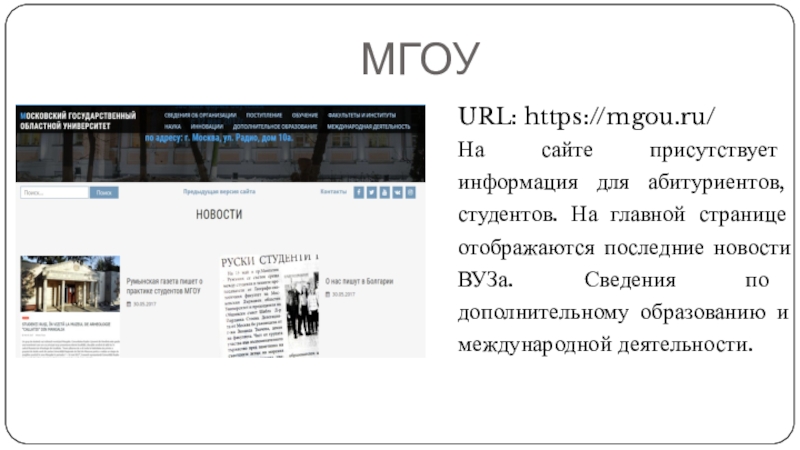 На сайте присутствует информация для абитуриентов, студентов. На главной странице