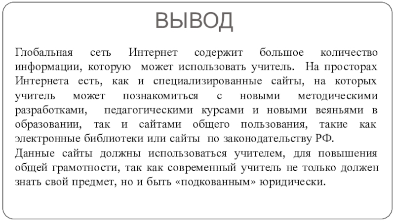 Данные сайты должны использоваться учителем, для повышения общей грамотности, так как современный учитель не только должен знать свой предмет, но и быть «подкованным» юридически.