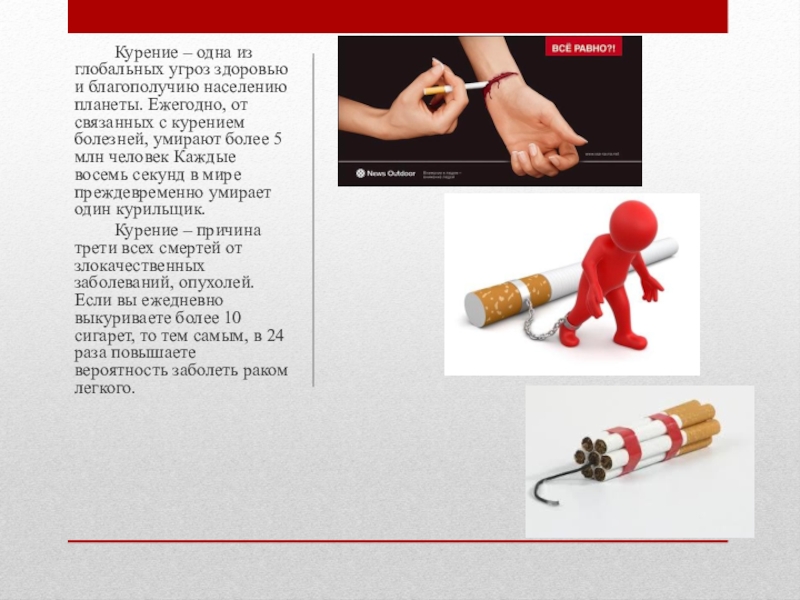 Слайд 3 Курение – одна из глобальных угроз здоровью и благополучию населению планеты.