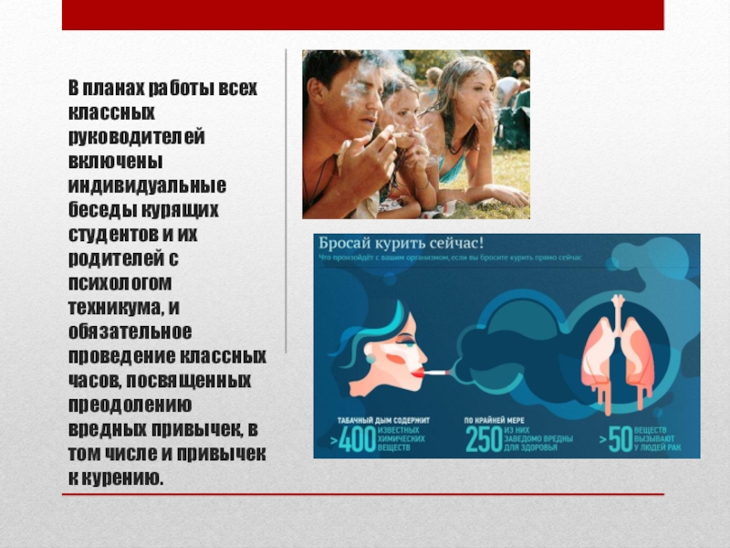 Слайд 16В планах работы всех классных руководителей включены индивидуальные беседы курящих студентов