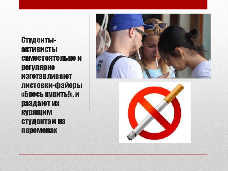 Слайд 14Студенты-активисты самостоятельно и регулярно изготавливают листовки-файеры «Брось курить!», и раздают их