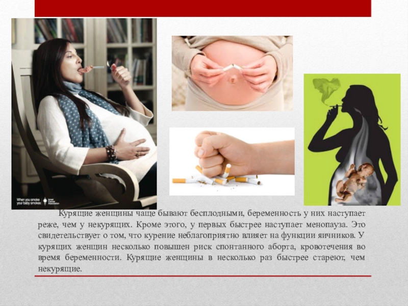 Слайд 5 Курящие женщины чаще бывают бесплодными, беременность у них наступает реже, чем