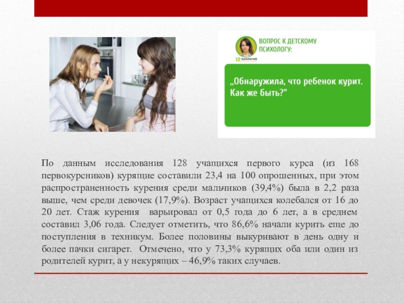 Слайд 10По данным исследования 128 учащихся первого курса (из 168 первокурсников) курящие