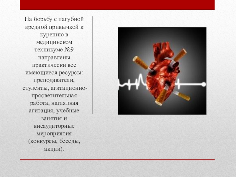 Слайд 12На борьбу с пагубной вредной привычкой к курению в медицинском техникуме