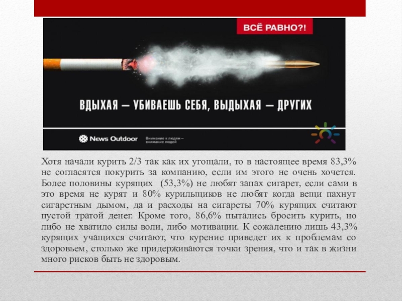 Слайд 11Хотя начали курить 2/3 так как их угощали, то в настоящее