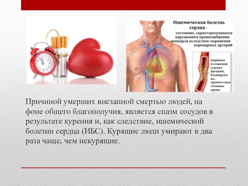 сосудов в результате курения и, как следствие, ишемической болезни сердца (ИБС). Курящие люди умирают в два раза чаще, чем некурящие.