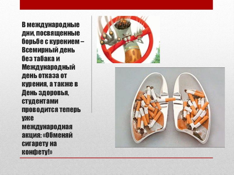 табака и Международный день отказа от курения, а также в День здоровья, студентами проводится теперь уже международная акция: «Обменяй сигарету на конфету!»