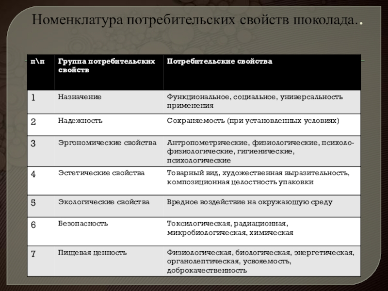 Слайд 9Номенклатура потребительских свойств шоколада..