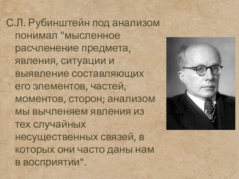 Слайд 5С.Л. Рубинштейн под анализом понимал "мысленное расчленение предмета, явления, ситуации и выявление
