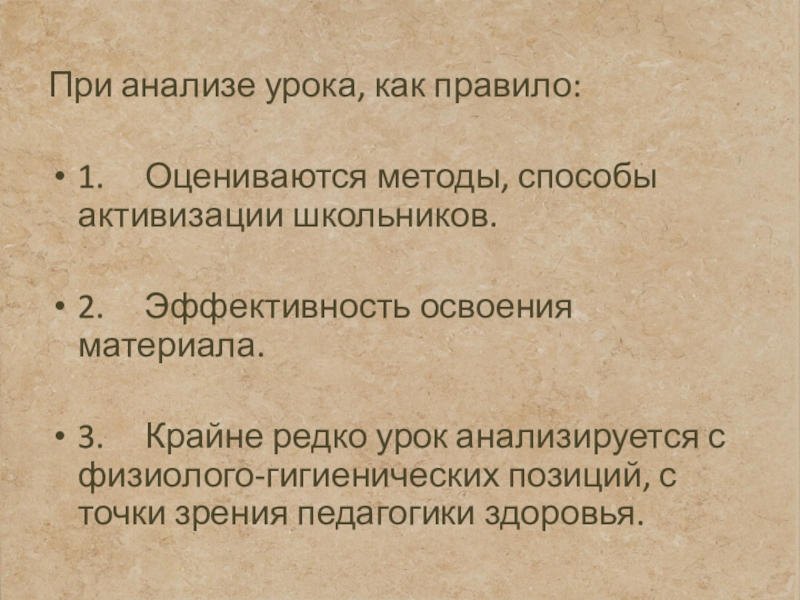 3.     Крайне редко урок анализируется с физиолого-гигиенических позиций, с точки зрения педагогики здоровья.