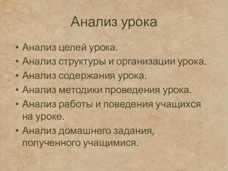 Анализ урокаАнализ целей урока. Анализ структуры и организации урока. Анализ содержания урока. Анализ методики проведения урока. Анализ работы