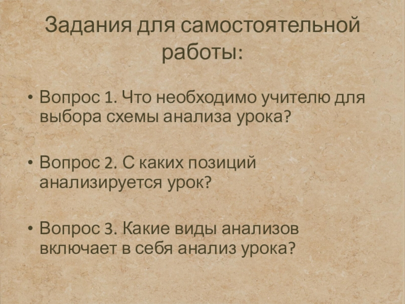 Задания для самостоятельной работы:Вопрос 1. Что необходимо учителю для выбора схемы анализа урока?Вопрос 2. С каких позиций