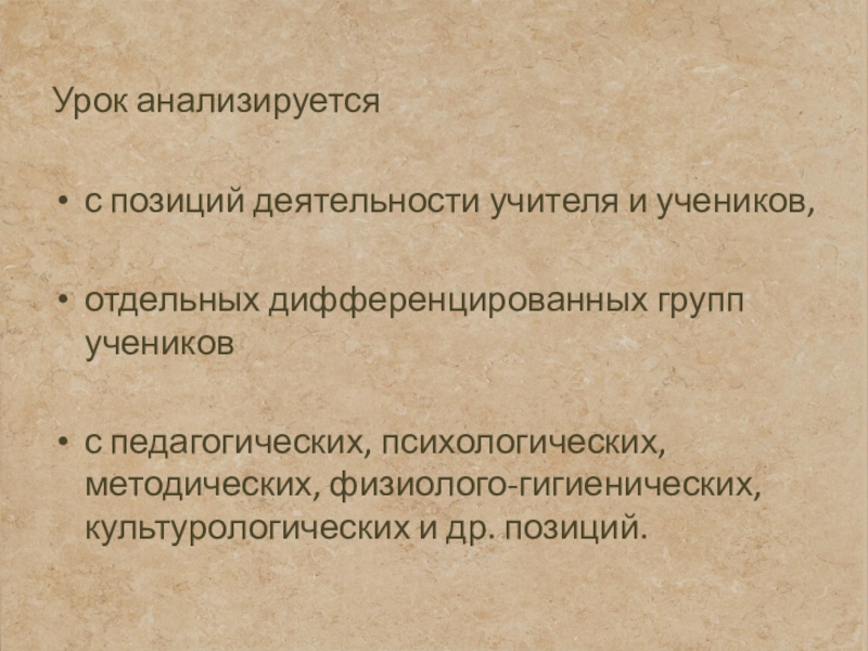 Урок анализируетсяс позиций деятельности учителя и учеников,отдельных дифференцированных групп учениковс педагогических, психологических, методических, физиолого-гигиенических, культурологических и др.