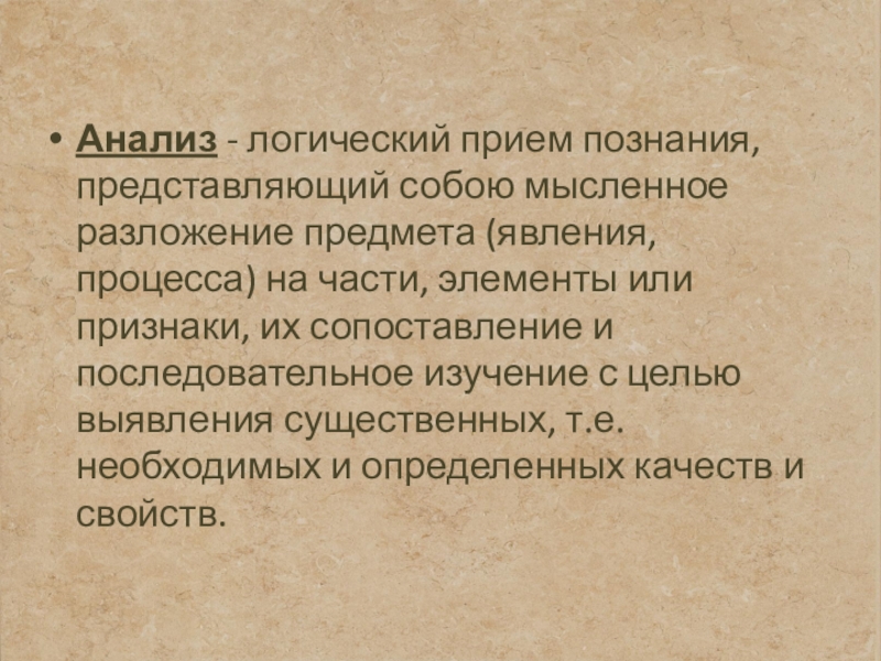 Анализ - логический прием познания, представляющий собою мысленное разложение предмета (явления, процесса) на части, элементы или признаки, их