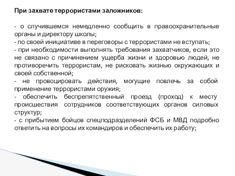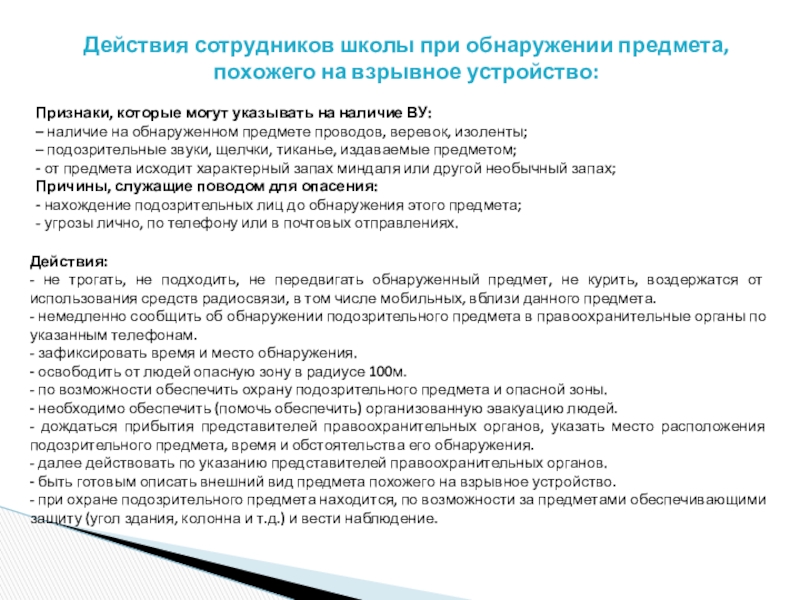 - быть готовым описать внешний вид предмета похожего на взрывное устройство.