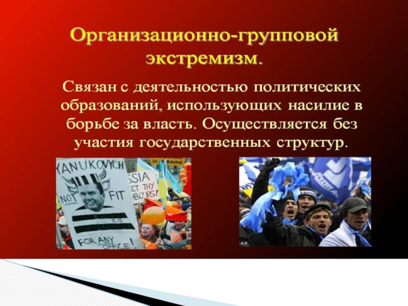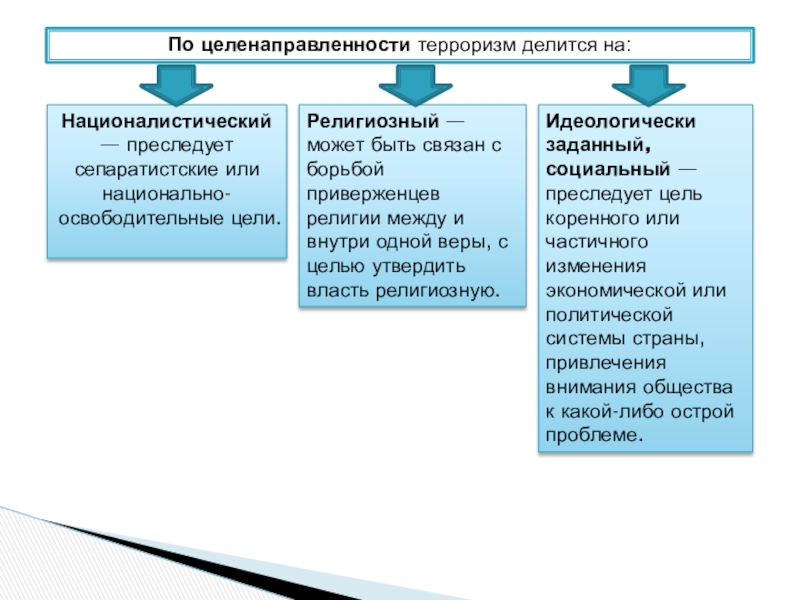 Организованный, коллективный — террористическая деятельность планируется и реализуется некой организацией (народовольцы, эсеры, ИРА, Аль-Каида, ИГИЛ и др.) Организованный терроризм — наиболее распространённый в современном мире.