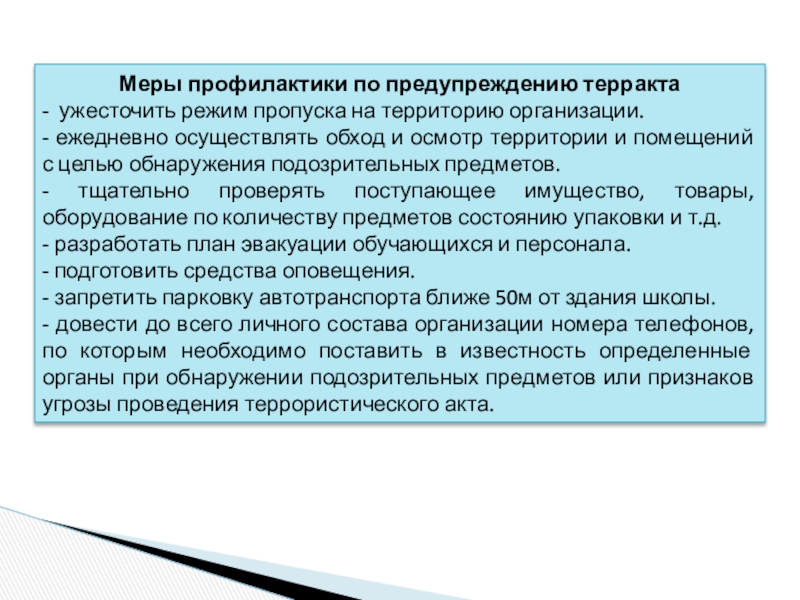 - не трогать, не подходить, не передвигать обнаруженный предмет, не курить, воздержатся от использования средств радиосвязи, в том числе мобильных, вблизи данного предмета.