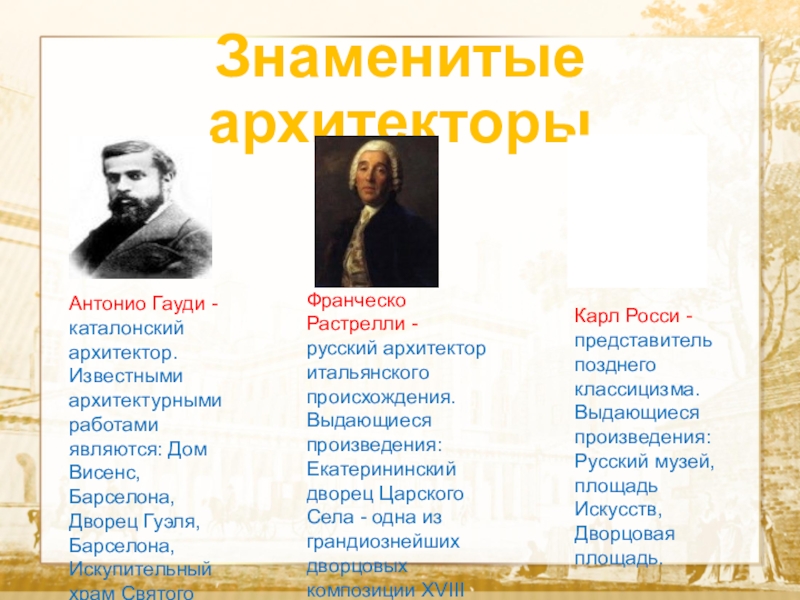 Антонио Гауди - каталонский архитектор. Известными архитектурными работами являются: Дом Висенс, Барселона, Дворец Гуэля, Барселона, Искупительный храм Святого Семейства, Дом Бальо, Дом Мила и др.