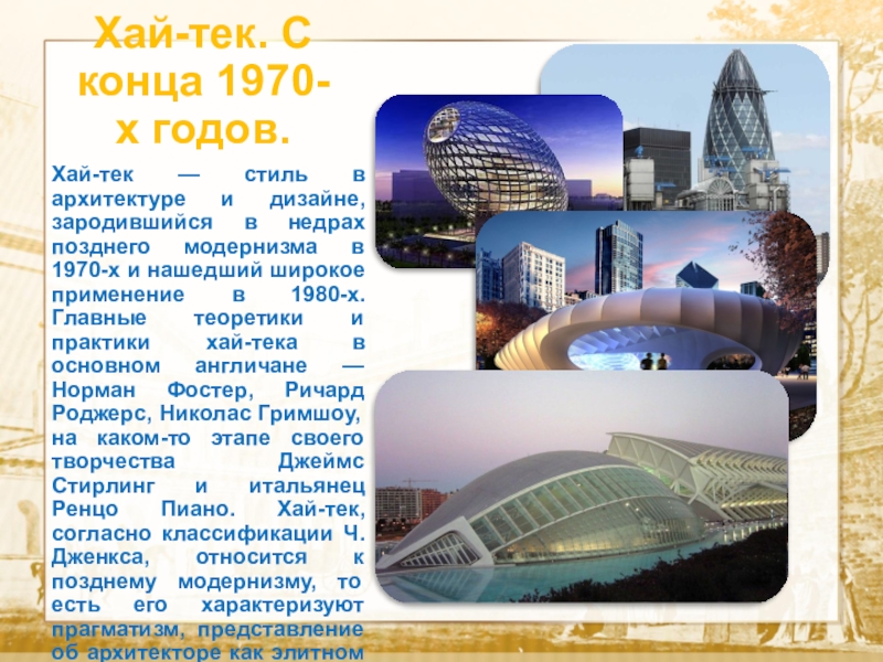 Норман Фостер – представитель «хай - тек». Знаменитые работы: В Астане «Дворец Мира и Согласия» (2006) и торгово-развлекательный центр «Хан-Шатыр» (2010), Библиотека Первого президента (2013).