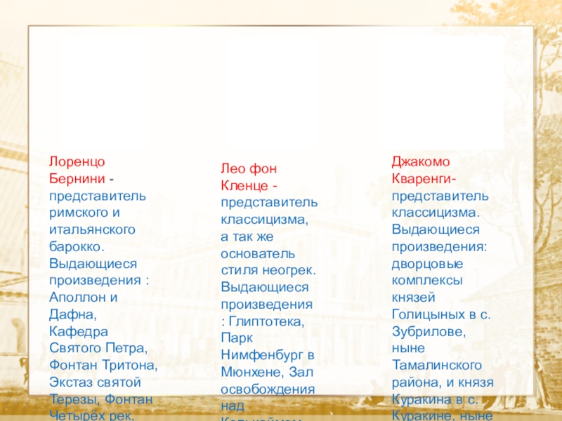 Лео фон Кленце -представитель классицизма, а так же основатель стиля неогрек. Выдающиеся произведения : Глиптотека, Парк Нимфенбург в Мюнхене, Зал освобождения над Кельхаймом, Валгалла, Регенсбург и др.
