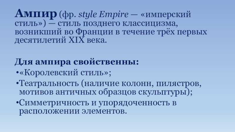 Слайд 7Ампир (фр. style Empire — «имперский стиль») — стиль позднего классицизма, возникший во Франции в течение трёх