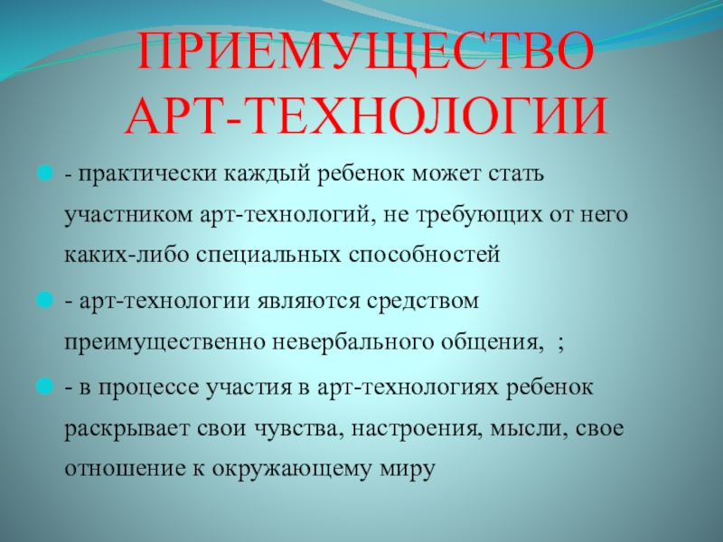 ПРИЕМУЩЕСТВО  АРТ-ТЕХНОЛОГИИ- практически каждый ребенок может стать участником арт-технологий, не требующих от него каких-либо специальных способностей