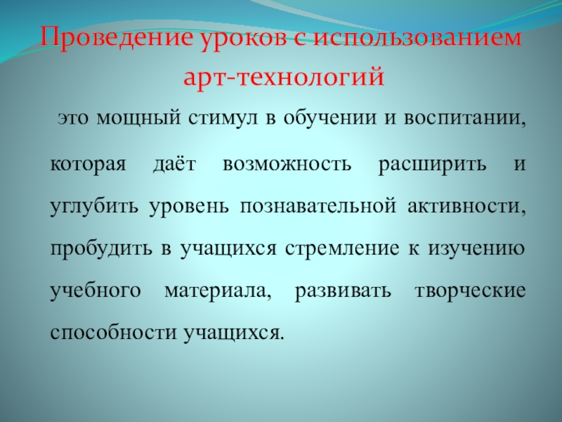 Проведение уроков с использованием арт-технологий  это мощный стимул в обучении и воспитании, которая даёт возможность расширить