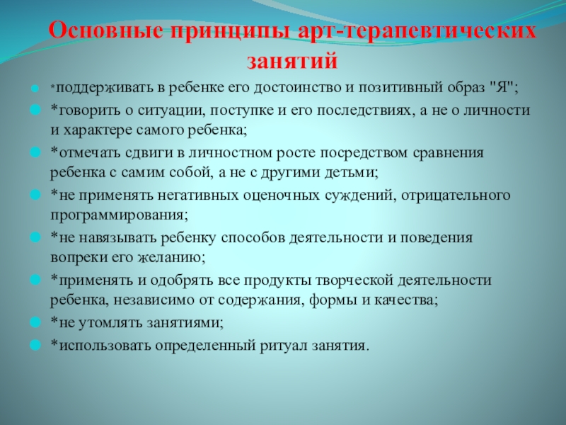 Слайд 6 Основные принципы арт-терапевтических занятий