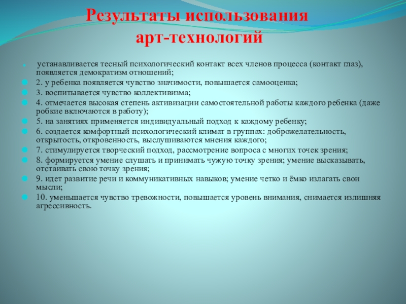 Результаты использования  арт-технологий  устанавливается тесный психологический