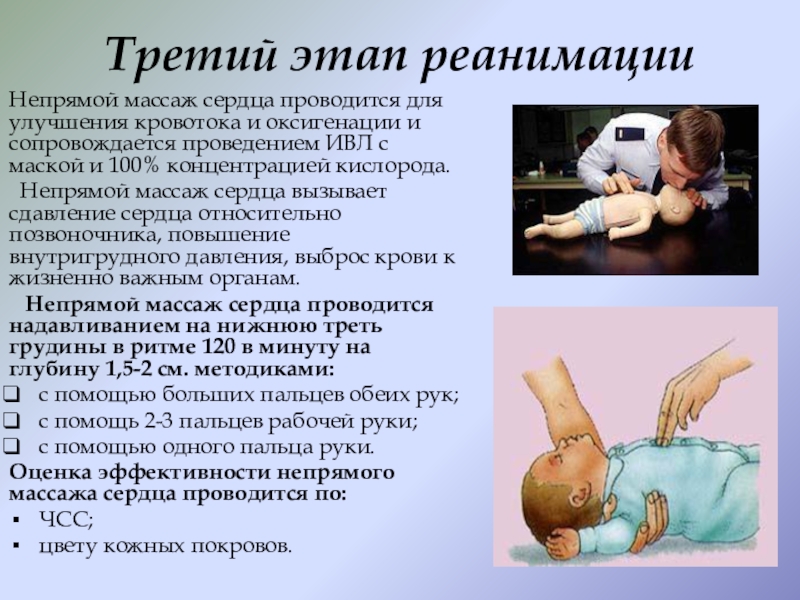 Непрямой массаж сердца проводится надавливанием на нижнюю треть грудины в ритме 120 в минуту на глубину 1,5-2 см. методиками: