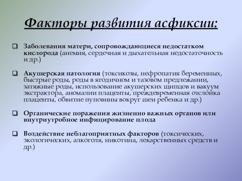 Заболевания матери, сопровождающиеся недостатком кислорода (анемия, сердечная и дыхательная