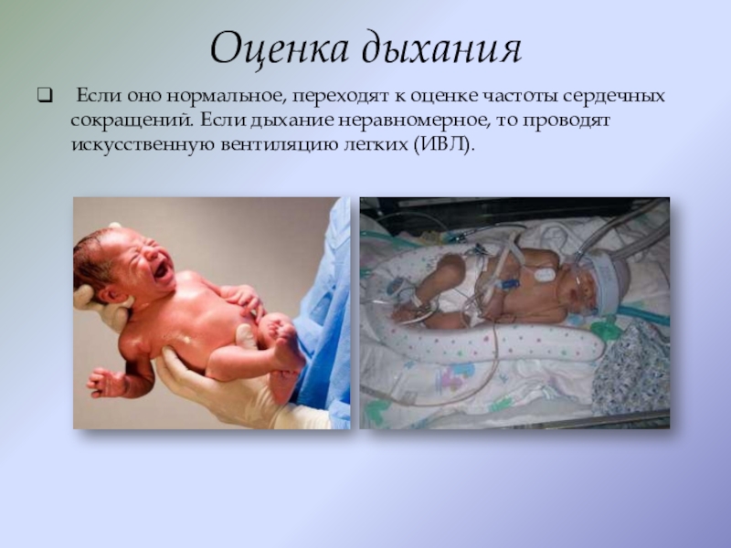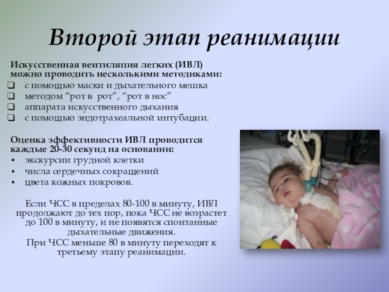 Если ЧСС в пределах 80-100 в минуту, ИВЛ продолжают до тех пор, пока ЧСС не возрастет до 100 в минуту, и не появятся спонтанные дыхательные движения.
