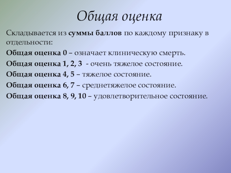 Общая оценка 1, 2, 3 - очень тяжелое состояние.
