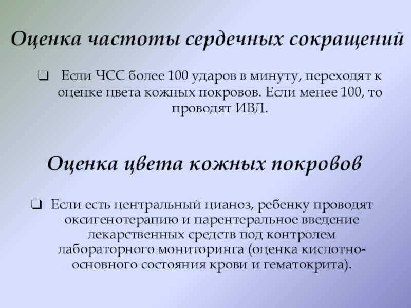 переходят к оценке цвета кожных покровов. Если менее 100, то проводят ИВЛ.