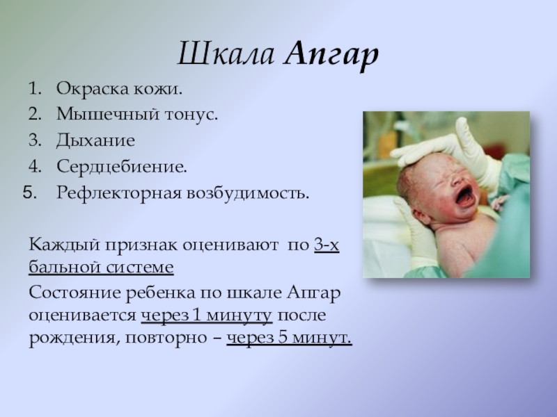 ребенка по шкале Апгар оценивается через 1 минуту после рождения, повторно – через 5 минут.
