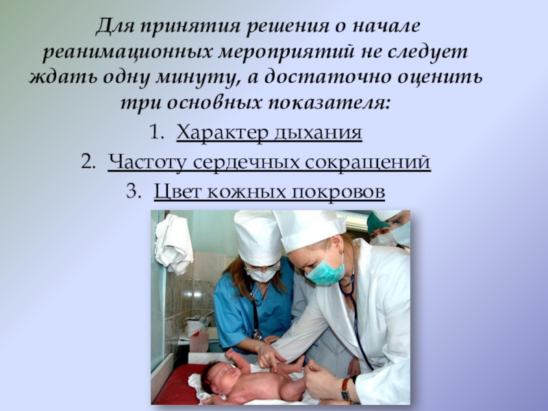 произвести оценку ребенка по трем жизненно важным критериям (дыхание, ЧСС, цвет кожных покровов).