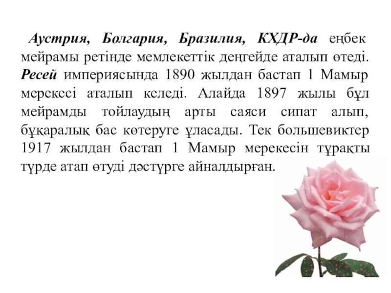 Слайд 8 Аустрия, Болгария, Бразилия, КХДР-да еңбек мейрамы ретінде мемлекеттік деңгейде аталып
