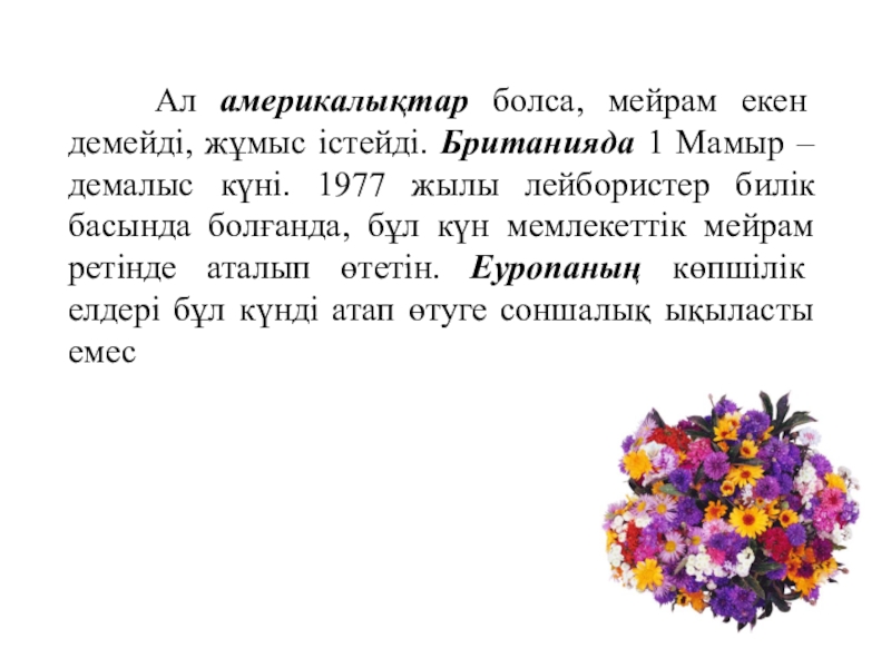 Ал америкалықтар болса, мейрам екен демейді, жұмыс істейді. Британияда 1 Мамыр – демалыс күні. 1977