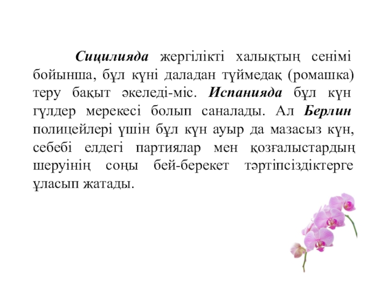 Слайд 6 Сицилияда жергілікті халықтың сенімі бойынша, бұл күні даладан түймедақ