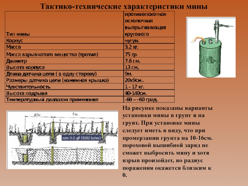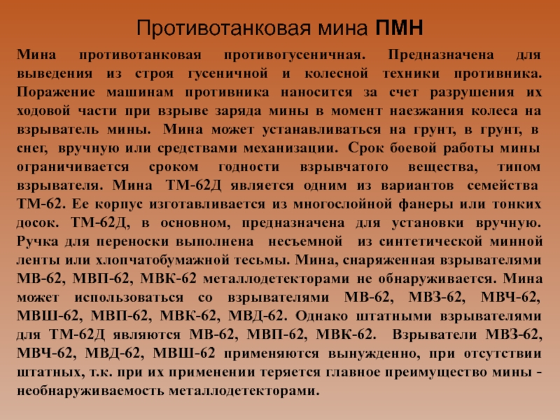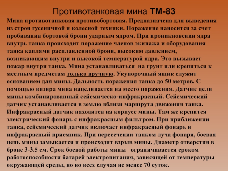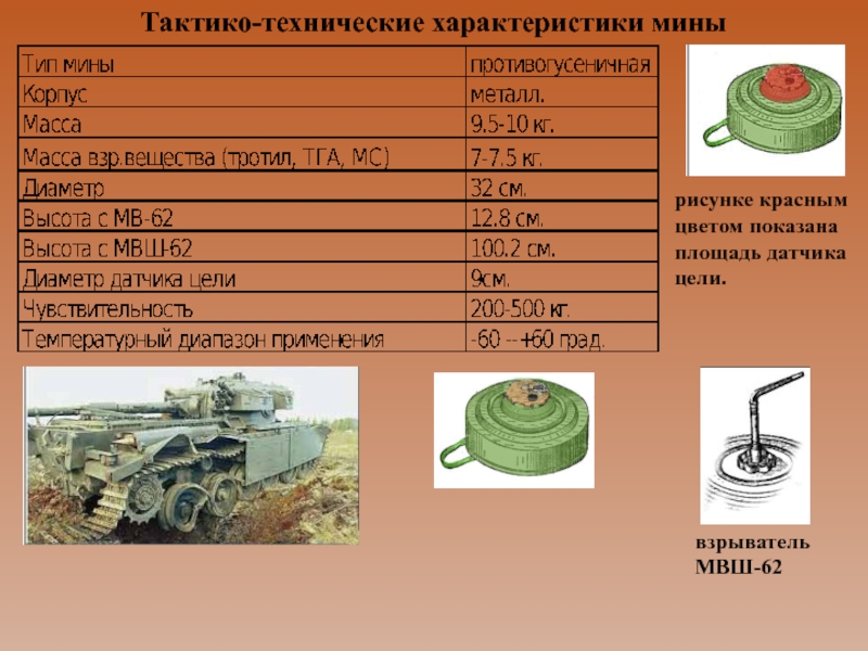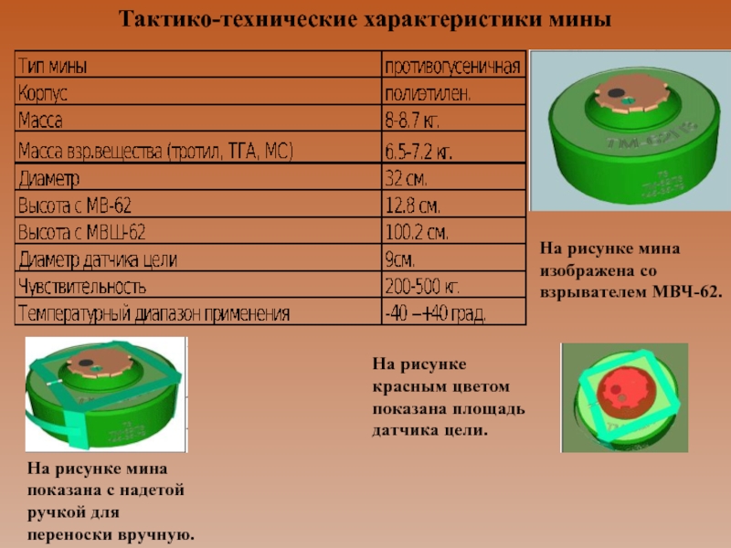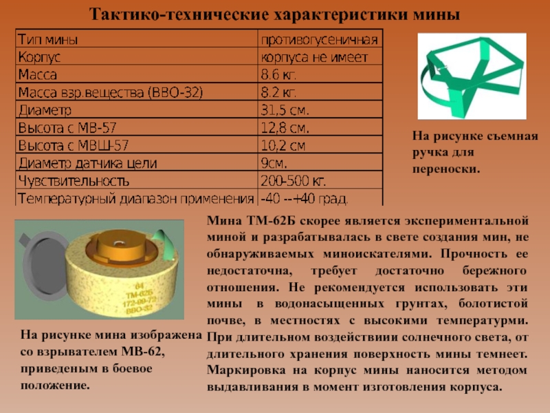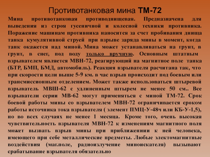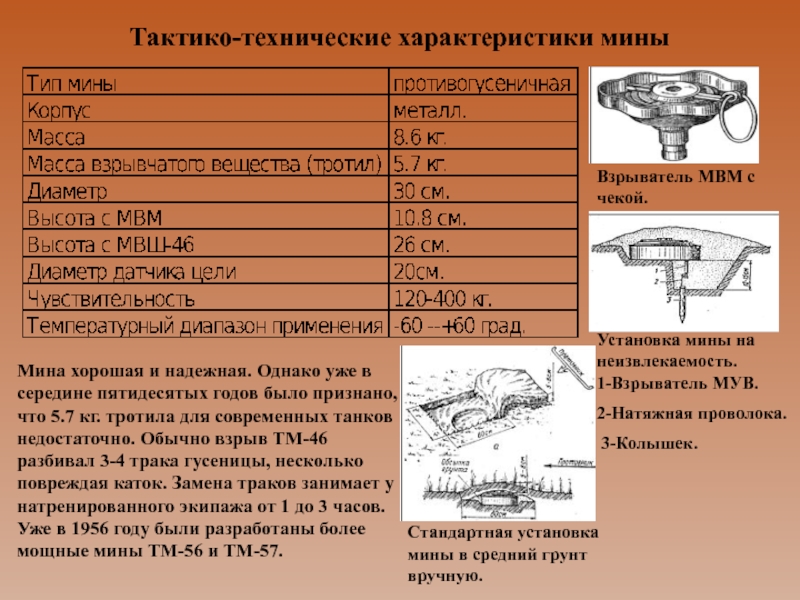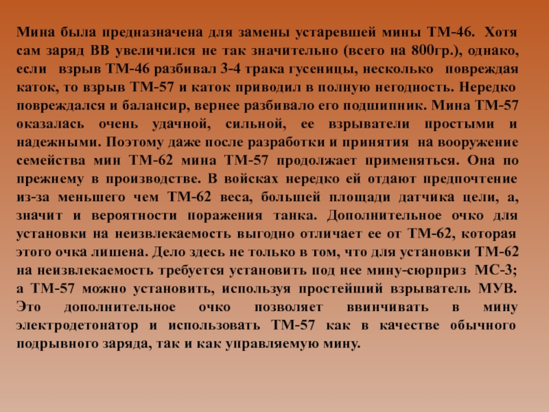 Слайд 20Мина была предназначена для замены устаревшей мины ТМ-46. Хотя сам заряд