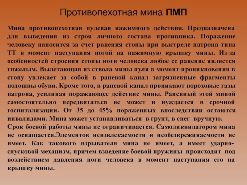 строя личного состава противника. Поражение человеку наносится за счет ранения стопы при выстреле патрона типа ТТ в момент наступания ногой на нажимную крышку мины. Из-за особенностей строения стопы ноги человека любое ее ранение является тяжелым. Вылетающая из ствола мины пуля в момент проникновения в стопу увлекает за собой в раневой канал загрязненные фрагменты подошвы обуви. Кроме того, в раневой канал проникают пороховые газы патрона, усиливая поражающее действие мины. Раненный этой миной самостоятельно передвигаться не может и нуждается в срочной госпитализации. От 35 до 45% пораженных впоследствии остаются инвалидами. Мина может устанавливаться в грунт, в снег вручную.