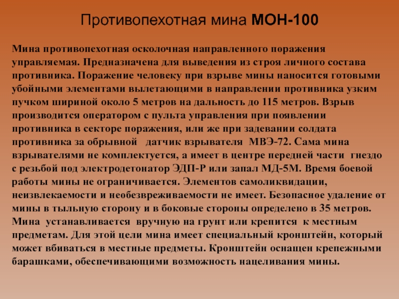из строя личного состава противника. Поражение человеку при взрыве мины наносится готовыми убойными элементами вылетающими в направлении противника узким пучком шириной около 5 метров на дальность до 115 метров. Взрыв производится оператором с пульта управления при появлении противника в секторе поражения, или же при задевании солдата противника за обрывной датчик взрывателя МВЭ-72. Сама мина взрывателями не комплектуется, а имеет в центре передней части гнездо с резьбой под электродетонатор ЭДП-Р или запал МД-5М. Время боевой работы мины не ограничивается. Элементов самоликвидации, неизвлекаемости и необезвреживаемости не имеет. Безопасное удаление от мины в тыльную сторону и в боковые стороны определено в 35 метров. Мина устанавливается вручную на грунт или крепится к местным предметам. Для этой цели мина имеет специальный кронштейн, который может вбиваться в местные предметы. Кронштейн оснащен крепежными барашками, обеспечивающими возможность нацеливания мины.